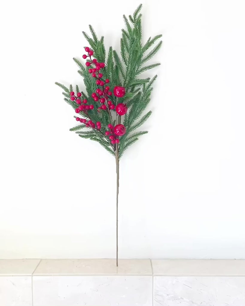 Add a festive touch to holiday arrangements with this 26" Red Apple & Berry Norfolk Pine Stem. Featuring lifelike “real touch” Norfolk pine needles accented by glossy red berries and realistic faux apples, this high-quality artificial stem is perfect for centerpieces, vases, wreath embellishments, or holiday floral designs. A versatile and reusable décor element for traditional and farmhouse Christmas styles.